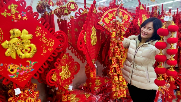 “年來到,年來到。小妞要花,小小要炮!辟I幾串鞭炮和小燈籠裝飾一下自己院子,很有喜慶氣氛。圖為山村媳婦在買裝飾家庭的年貨。