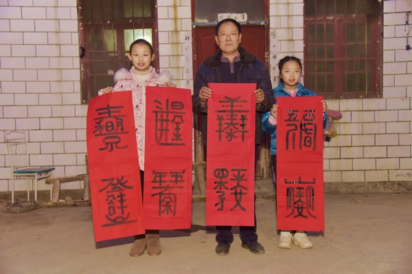 河南鶴壁淇縣馬疙瘩村60歲退休老教師朱全貴老師在家蒸好花糕后,緊接著要書寫對(duì)聯(lián),朱老師在鄉(xiāng)里任教幾十年,桃李滿天下,每年他都幫助別人寫對(duì)聯(lián),這是他自己獨(dú)創(chuàng)的書寫對(duì)聯(lián)方式,大家猜猜這是啥字?