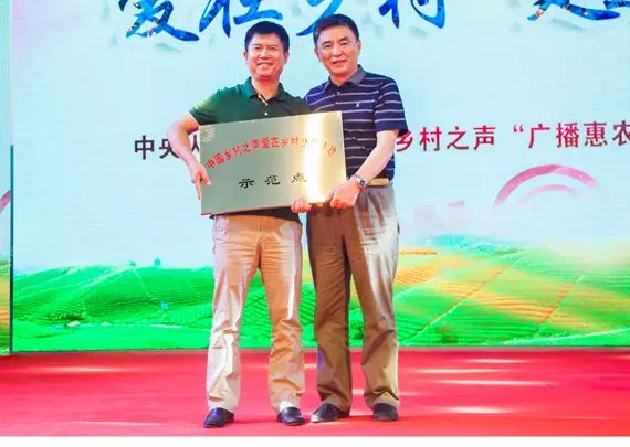 中央人民廣播電臺駐湖南記者站站長蔣琦為常德人民廣播電視臺授“中央人民廣播電臺廣播惠農(nóng)工程示范臺”牌匾。
