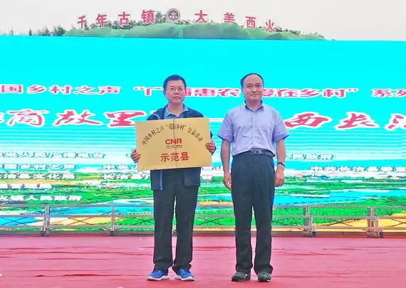 中央人民廣播電臺山西記者站康維佳站長授“中央人民廣播電臺中國鄉(xiāng)村之聲廣播惠農(nóng)工程示范縣”牌匾,中共長治縣委宣傳部張延節(jié)部長接牌。