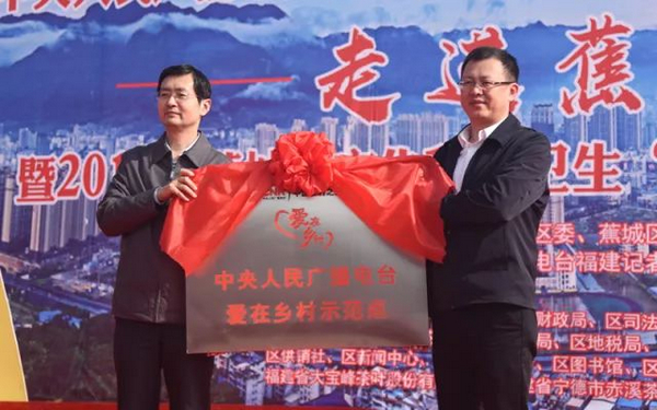 中央人民廣播電臺(tái)駐福建記者站站長洪波授“中央人民廣播電臺(tái)愛在鄉(xiāng)村示范點(diǎn)”牌匾,蕉城區(qū)委常委、宣傳部部長柳岳接牌。