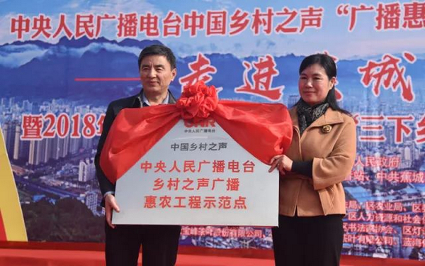 中央人民廣播電臺(tái)社教節(jié)目中心副主任陶煒授“中央人民廣播電臺(tái)中國鄉(xiāng)村之聲廣播惠農(nóng)工程示范點(diǎn)”牌匾,蕉城區(qū)人民政府副區(qū)長黃曉鶯接牌。