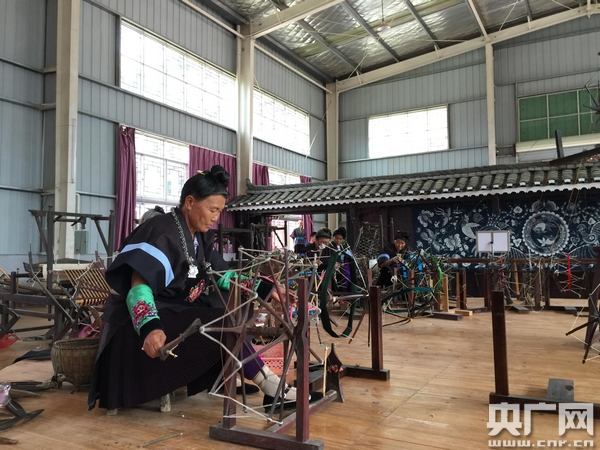 在苗族姑娘歐陽(yáng)珍珍的博物館一樓,幾十臺(tái)從民間搜羅的古老的紡線機(jī)與紡織機(jī)發(fā)出“沙沙沙”的聲音,一群苗族的老人正在做著她們一輩子都在做的事兒,紡線與織布。