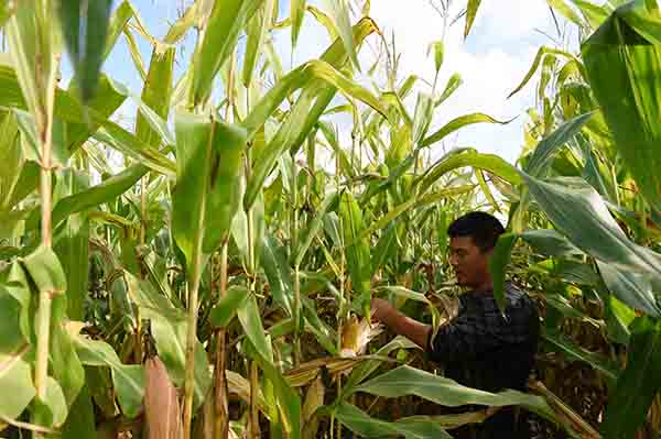 9月6日,黑龍江省富裕縣龍安橋鎮(zhèn)富欣村的種糧大戶袁鳳波在查看自家玉米受旱情影響情況。袁鳳波今年種植玉米約2000畝,他預計受旱情影響將減產約五成。