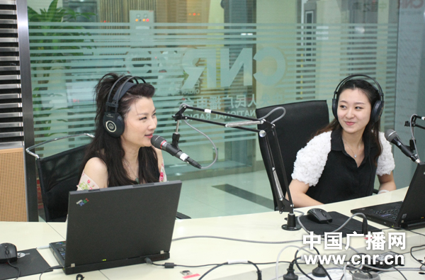 中國廣播藝術(shù)團青年歌手朱砂(左)與獨唱演員岳璐(右)在直播間參加直播(中廣網(wǎng)記者陳江南_攝)