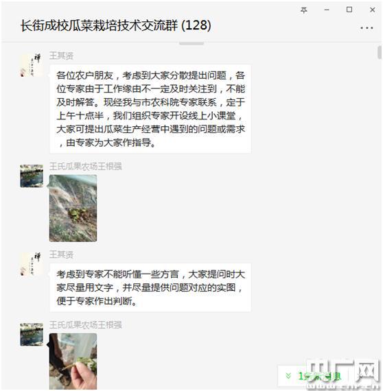央廣網(wǎng)寧海3月4日消息(記者王權 曹露浩 通訊員高嵩 徐銘懌 施斌)3月4日上午,浙江寧波寧?h長街成校組建的瓜菜栽培技術交流微信群里,農(nóng)戶提問、專家解答的“云問診”線上課堂如約開課,寧波農(nóng)科院、寧海農(nóng)業(yè)農(nóng)村局的10多名種植專家在線教學。