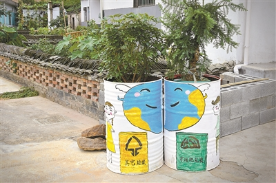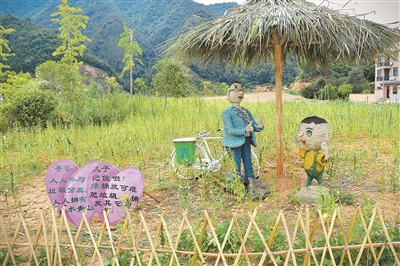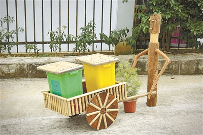 稻草、廢棄的木材、廢棄的自行車零件等,這些原本在農(nóng)戶眼里的垃圾,經(jīng)過巧妙的整理,成為了一個個裝飾的元素,就連墻上的垃圾分類宣傳語也轉(zhuǎn)化成了“爸爸和兒子間對話”,讓人感到既新鮮又通俗易懂。