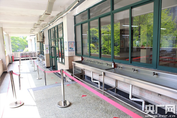 “在下周高三學生復課之前,我們已經對學生進入食堂的線路包括學生用餐的位置都做了定點定人的處理。學生在進入食堂就餐之前需要用免洗洗手液進行手部消毒工作,而食堂門口排隊則是按照地上標注的每個紅點一個人,間隔一米排隊”,長征中學副校長朱理清告訴記者。
