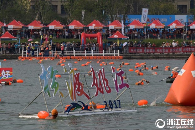 8月6日,2017寧波橫渡姚江活動(dòng)在江北區(qū)雙古渡公園姚江水域舉行,500名游泳選手頭頂烈日,橫渡母親河。(浙江在線拍友 龔國(guó)榮 攝)
