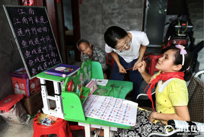 13歲的“輪椅女孩”汪凌瑩,從小遺傳母親的脆骨癥,無法站立行走,也無法上學(xué)。從2014年開始,一支由淳安浪川鄉(xiāng)雙源完全小學(xué)的12名鄉(xiāng)村教師組成的送教隊(duì)伍,每周輪流為汪凌瑩送課上門,近三年來風(fēng)雨無阻。這12位教師中,有到了退休年齡的老教師,也有剛剛加入教師隊(duì)伍的年輕90后!