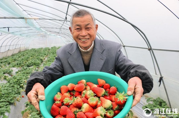 1月17日,湖州許溇村,今年的頭茬大棚草莓已進入初果期,果農(nóng)忙采摘,商販忙銷售,頭茬草莓搶“鮮”上市。(浙江在線拍友 朱偉良 攝)