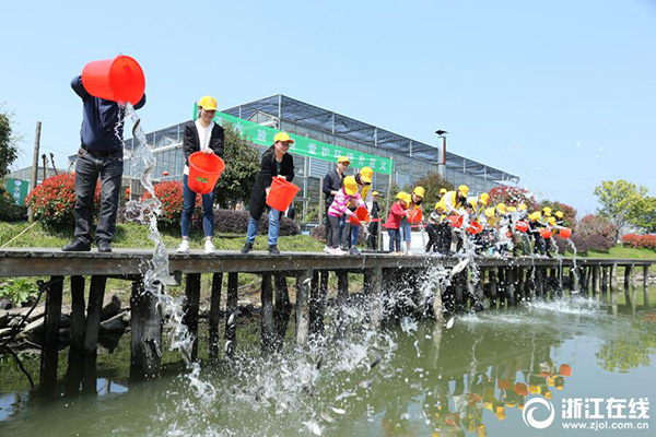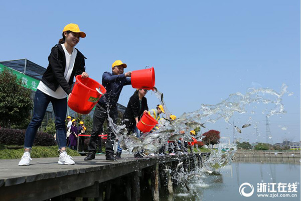 3月27日,德清縣乾元鎮(zhèn)各級人大代表、新居民以及當?shù)赜變簣@小朋友等50多人,在該鎮(zhèn)聯(lián)合村、恒星村等地,把花鰱、草魚以及花骨魚等2萬余尾魚苗放歸清澈的河水中,以進一步改善水質(zhì),確!拔逅仓巍背晒。(沈興華 倪立芳 攝)