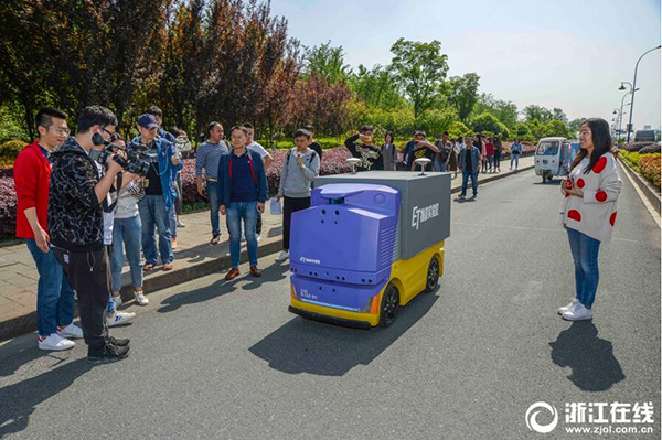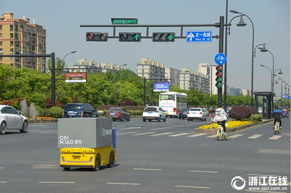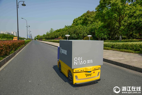 2018年4月18日,在杭州市文一西路上,一輛半人高的四方小車,在無(wú)人駕駛的情況下,一路停停走走,行駛在送快遞的路上。據(jù)了解,這是菜鳥旗下ET物流實(shí)驗(yàn)室研發(fā)的無(wú)人車,正在進(jìn)行路測(cè)。當(dāng)日,在10公里的路測(cè)路段,無(wú)人車已經(jīng)能夠完成內(nèi)部的文件等收發(fā)配送。菜鳥無(wú)人車定位在末端配送,車速最高控制在15km/小時(shí),車輛制動(dòng)距離可以控制在0.5——0.3米。菜鳥無(wú)人車量產(chǎn)商用在即,年內(nèi)將全面進(jìn)入末端進(jìn)行配送。(記者 楊曉軒 攝)