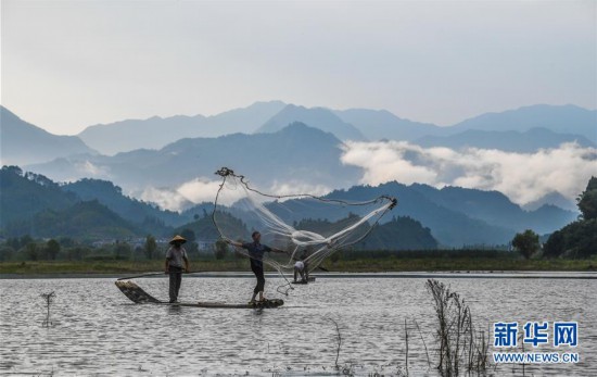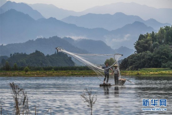 8月1日,杭州淳安縣汾口鎮(zhèn)紅星村的漁民乘著竹排,在千島湖的支流武強溪上進行撒網(wǎng)捕撈作業(yè)(無人機拍攝)。