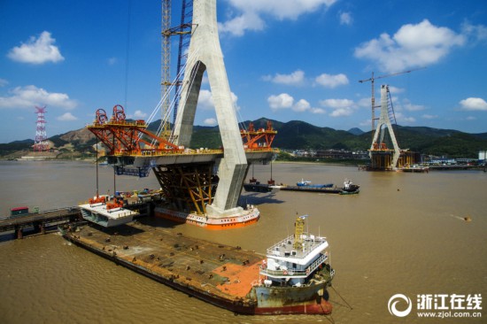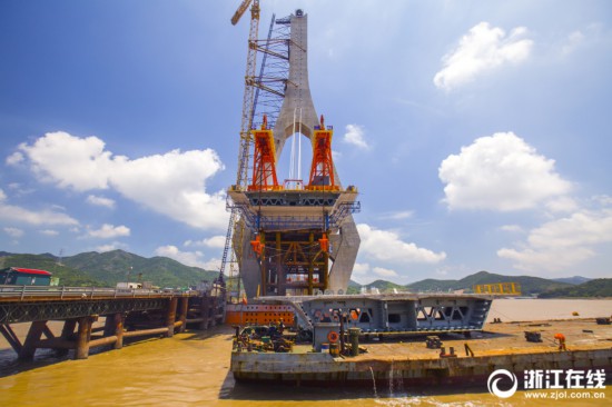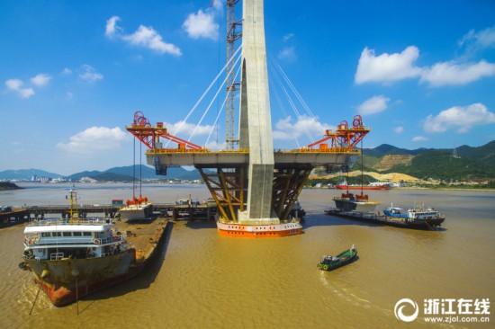 8月5日下午,寧波舟山港主通道富翅門大橋A標(biāo)架梁現(xiàn)場(chǎng),中交二航局兩臺(tái)起吊功率450噸架橋機(jī)把2片各重310噸的鋼混結(jié)合梁穩(wěn)穩(wěn)地吊裝至富翅門大橋A標(biāo)主橋橋面。目前,富翅門A標(biāo)已完成11片鋼混結(jié)合梁吊裝。