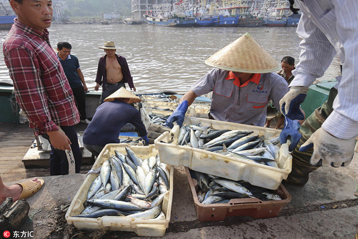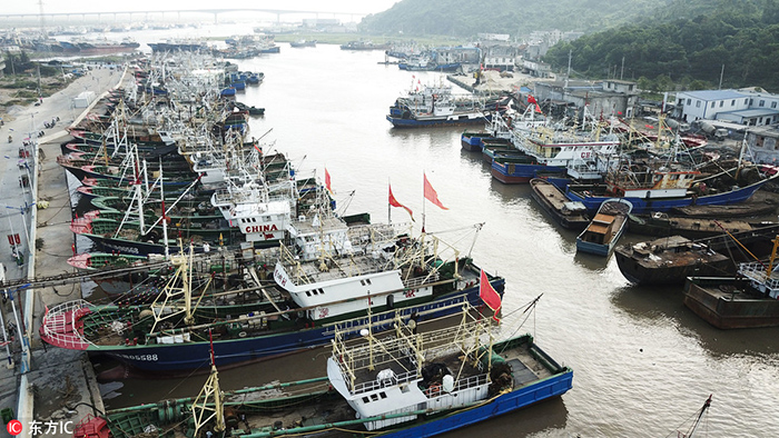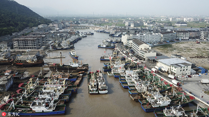 8月12日,在浙江省溫州市蒼南縣舥艚港區(qū),一艘艘漁船陸續(xù)進入避風港。