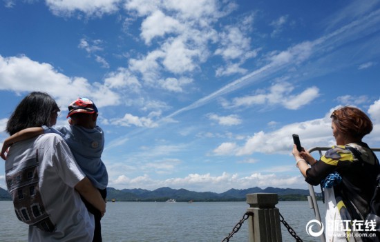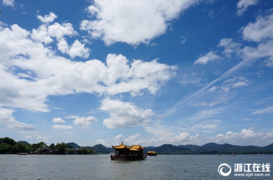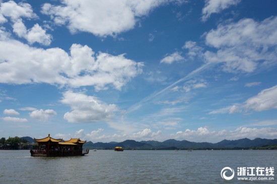 8月19日,杭州最高氣溫達35℃,再次達到了高溫線(35℃)。西湖上空藍天白云相伴,美不勝收。(記者 吳煌)