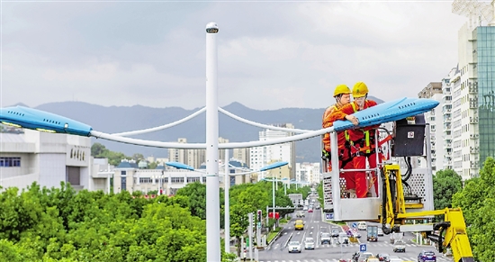 近日,在溫嶺人民路上,當(dāng)?shù)毓╇姽韭窡艄芾硭臋z修人員正在檢修路燈。