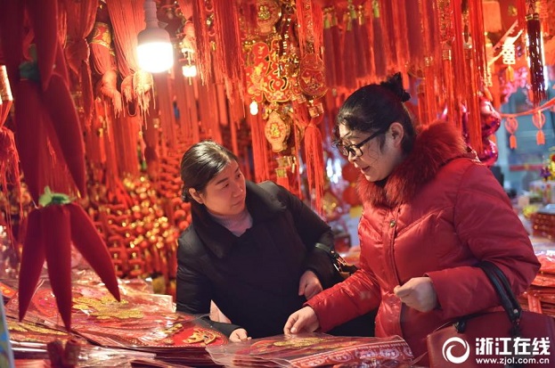 1月7日,市民在金華市農(nóng)貿(mào)市場(chǎng)選購(gòu)新年飾品。春節(jié)臨近,許多商家將各種對(duì)聯(lián)、燈籠、中國(guó)結(jié)、生肖、彩燈等春節(jié)年貨已經(jīng)悄然上架,年貨市場(chǎng)購(gòu)銷兩旺、紅紅火火。(浙江在線拍友 孔德賓 攝)