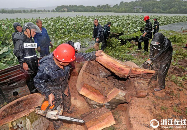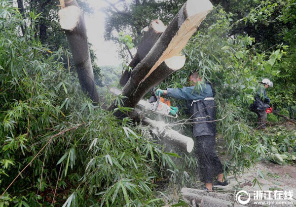 8月10日,臺(tái)風(fēng)“利奇馬”凌晨登陸后,杭州多處樹(shù)木倒伏,西湖景區(qū)相關(guān)部門(mén)工作人員全力以赴搶扶樹(shù)木,確保道路暢通。