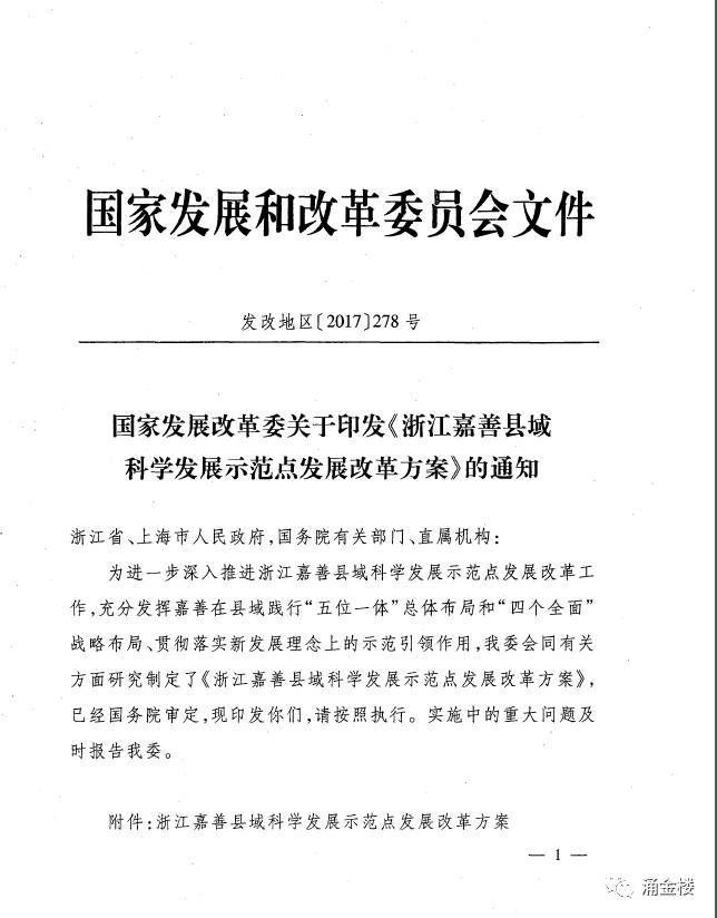 2017年2月16日,國(guó)家發(fā)展改革委關(guān)于印發(fā)《浙江嘉善縣域科學(xué)發(fā)展示范點(diǎn)發(fā)展改革方案》的通知。 ( 記者 張超 劉樂平)