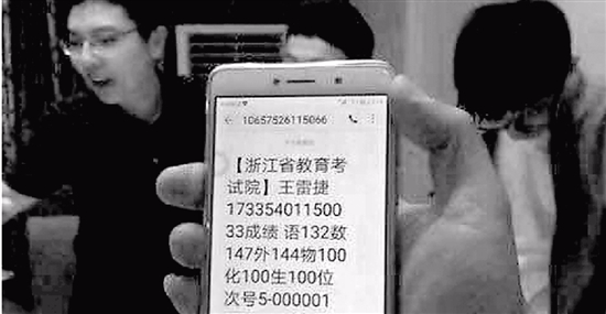 “我晚上7點(diǎn)多接到王雷捷的電話,告訴我他得了浙江第一,我高興得要蹦起來,發(fā)了一條朋友圈,然后手機(jī)就炸了。”王雷捷的班主任陳柳鈞老師說,她是浙江第一個發(fā)布王雷捷高考奪魁的人。“我認(rèn)為王雷捷得到第一不算特別意外,他的成績在學(xué)校里一直都是第一的,如果考得不好反而不正常!蓖趵捉荼救说故峭Φǎ髦诳蜓坨R的他,靜靜地站在老師身邊,一直在手機(jī)上接收各種祝福。
