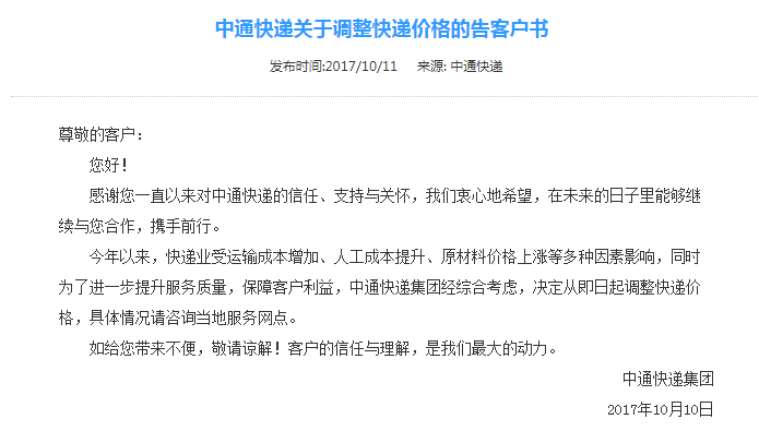 10日,中通方面表示,今年以來,快遞業(yè)受運(yùn)輸成本增加、人工成本提升、原材料價格上漲等多種因素影響,同時為了進(jìn)一步提升服務(wù)質(zhì)量,保障客戶利益,中通快遞集團(tuán)經(jīng)綜合考慮,決定從即日起調(diào)整快遞價格;11日,韻達(dá)快遞表示,為了持續(xù)提高服務(wù)質(zhì)量、更好地提供更優(yōu)質(zhì)、更便捷、更高效的快遞服務(wù),同時受人力、物料以及運(yùn)營成本攀升等影響,從即日起,對快遞價格進(jìn)行調(diào)整。