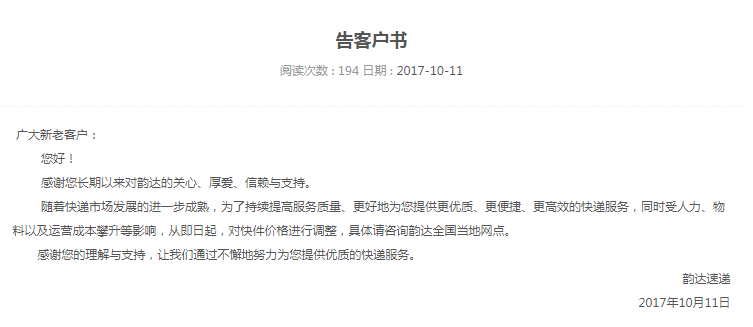 離雙十一只剩一個月期限,中通快遞猝不及防宣布上調(diào)快遞價格。緊隨其后,韻達(dá)快遞也跟進(jìn)漲價。