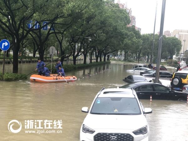 記者在溫嶺市區(qū)看到,溫嶺國際大酒店門口,積水約莫有一米深,搶險人員正乘船查看情況,為下一步工作做準(zhǔn)備。受強風(fēng)暴雨影響,一些碗口粗的樹被吹倒或刮斷。從這里出發(fā),沿著中華路向東南方向行走,一些地方的積水已沒過膝蓋,一些車輛已經(jīng)“趴窩”。