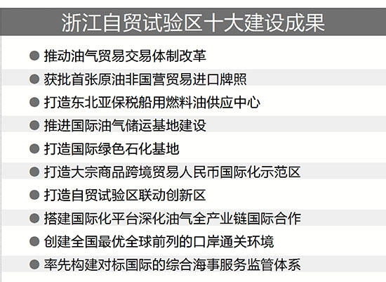 “除了一項(xiàng)項(xiàng)建設(shè)成果,浙江自貿(mào)試驗(yàn)區(qū)還闖出了一條油氣全產(chǎn)業(yè)鏈發(fā)展的浙江新路子!闭憬再Q(mào)試驗(yàn)區(qū)管委會(huì)副主任夏文忠介紹,通過(guò)首創(chuàng)性、差異化改革,浙江自貿(mào)試驗(yàn)區(qū)已形成了116項(xiàng)含金量較高、特色鮮明的制度創(chuàng)新成果,其中27項(xiàng)創(chuàng)新經(jīng)驗(yàn)被全國(guó)復(fù)制推廣。